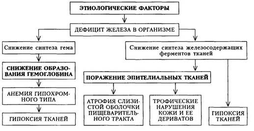 Патогенез. ЖДА возникает прежде всего в результате нарушения синтеза гемоглобина, так как железо входит в состав гема. Недостаточное образование гемоглобина служит причиной гипоксии тканей и развития циркуляторно-гипоксического синдрома. Дефицит железа способствует также нарушению синтеза тканевых ферментов, что приводит к изменению тканевого метаболизма. При этом прежде всего поражаются быстро обновляющиеся эпителиальные ткани — слизистая оболочка пищеварительного тракта, кожа и ее дериваты. Патогенез ЖДА представлен на схеме 25.