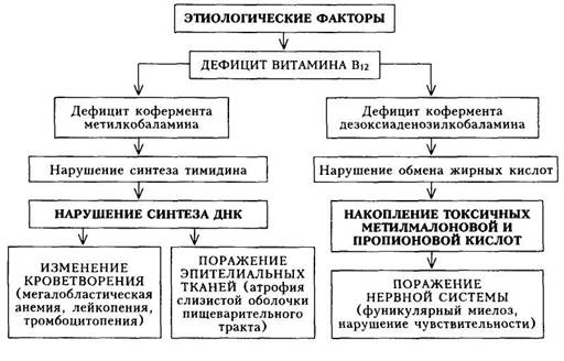 Сущность Biz-дефицитной анемии (В12ДА) состоит в нарушении образования дезоксирибонуклеиновой кислоты (ДНК) в связи с нехваткой в организме витамина Bi2 (цианокобаламина), что приводит к нарушению кроветворения, появлению в костном мозге мегалобластов, внутри-костномозговому разрушению эритрокариоцитов, снижению количества эритроцитов и гемоглобина, лейкопении, нейтропении и тромбоцитопении, а также к изменению ряда органов и систем (пищеварительный тракт, ЦНС).