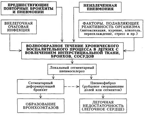 Этиология. Поскольку ХП является воспалительным заболеванием инфекционной природы, этиология ее соответствует этиологии П. Хотя нет микроорганизма, обусловливающего хроническое течение пневмонии, доказана различная степень значимости разнообразных возбудителей в переходе острого воспалительного процесса в хронический.