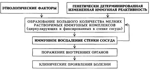 Патогенез. Под воздействием различных внешних факторов на фоне генетически детерминированной измененной иммунной реактивности развивается нарушение иммунного ответа, что проявляется в образовании большого количества мелких растворимых иммунных комплексов, циркулирующих в сосудистом русле. В состав иммунного комплекса входят антиген (в частности, HBs-антиген), антитело к нему и комплемент. Иммунные комплексы активно откладываются под эндотелием сосудов. Это ведет к повышению сосудистой проницаемости, развивающейся под влиянием вазоактивных аминов, которые высвобождаются из базофилов и тучных клеток или тромбоцитов при их дегрануляции в результате активации комплемента. Отложение иммунных комплексов в стенке сосуда приводит к воспалительному процессу и развитию выраженных морфологических