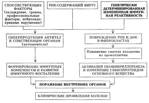 Патогенез. Под влиянием вируса и генетического фактора (при участии предрасполагающих факторов) происходит повреждение РНК и ДНК в фибробластах, что повышает синтез коллагена из проколлагена. Это активирует неофибриллогенез и способствует изменению гликопротеидов основного вещества соединительной ткани. В результате развиваются фиб-розно-склеротические изменения соединительной ткани. Параллельно происходит дисрегуляция иммунного ответа организма на внедрение вируса, что проявляется гиперпродукцией антител к собственным тканям (ау-тоантитела). Затем формируются иммунные комплексы, оседающие в микроцирку ляторном русле и внутренних органах, что приводит к развитию иммунного воспаления, однако выраженность иммунных и аутоиммунных нарушений при ССД не столь велика, как при СКВ.