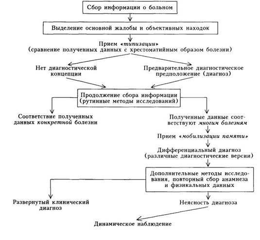 Таким образом, выделяя симптомы и синдромы, мы постоянно (по мере получения информации) сравниваем их с «эталонами» болезней и смотрим, какому же заболеванию соответствует полученный при исследовании пациента «образ» болезни.