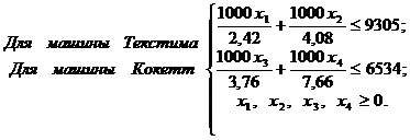 Таким образом, для получения максимальной прибыли, равной 660,60 тыс. руб., трикотажной фабрике рекомендуется выпускать 22,52 т трикотажного полотна артикула 150 на машине текстима и 50,05 т трикотажного полотна артикула 90 на машине кокетт. Остальные виды продукции не производить. При этом имеющиеся фонды рабочего времени машин текстима и кокетт будут использованы полностью.
