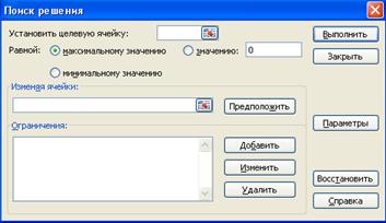 Управление диалоговым окном утилиты «Поиск решения» (см. рисунок 3.1) осуществляется следующим образом:
