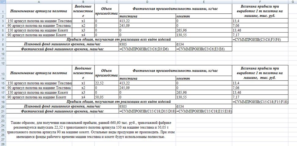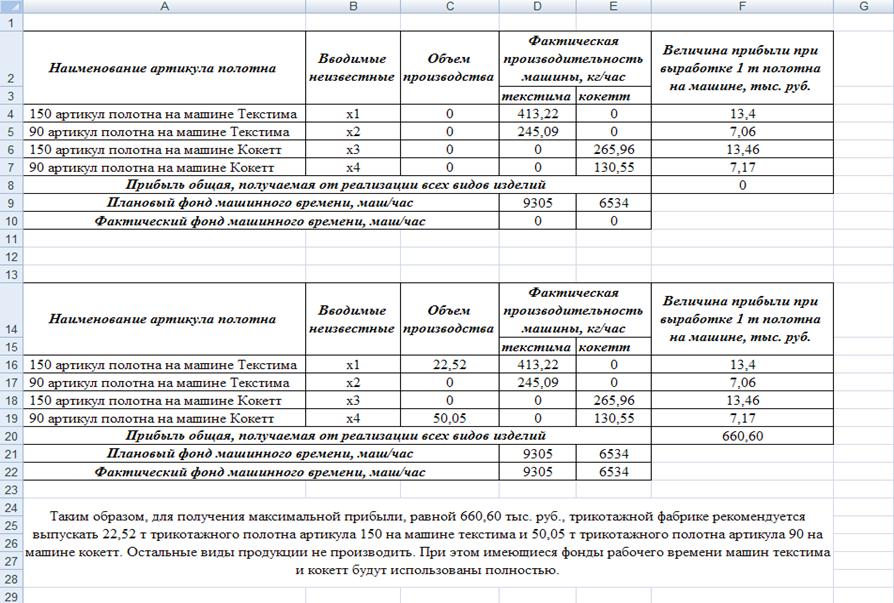 Трикотажная фабрика предполагает предложить потребителям полотна 150 и 90 артикулов. Требуется определить ассортимент указанных тканей, позволяющий фабрике получить максимальную прибыль на имеющемся оборудовании (машины Текстима и Кокетт). При этом следует определить какие артик.4.