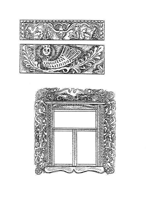 - Дети, посмотрите внимательно на избу и найдите элементы, которые украшают ее. Красным кружком обозначен наличник, синим – ставни. Найдите на изображениях избы, которые лежат у вас на столе, такие же элементы: наличник, ставни. Дети, посмотрите на рисунки наличников и скажите, что изображено здесь с помощью резьбы.