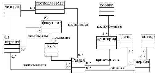 И опять-таки смысл этой диаграммы ясен без особых пояснений. Даже бегло рассмотрев ее, можно легко догадаться, что она описывает предметную область задачи об автоматизации работы некоего вуза или учебного центра. Обратите внимание на обозначения кратности на концах связей. А теперь немного усложним задачу (рис. 7):