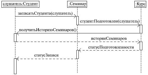 Думаем, смысл диаграммы вполне понятен: студент хочет записаться на некий семинар, предлагаемый в рамках некоторого учебного курса. С этой целью проводится проверка подготовленности студента, для чего запрашивается список (история) семинаров курса, уже пройденных студентом (перейти к следующему семинару можно, лишь проработав материал предыдущих занятий - знакомая картина, не правда ли?). После получения истории семинаров объект класса "Слушатель" получает статус подготовленности, на основе которой студенту сообщается результат (статус) его попытки записи на семинар. Кстати, обратите внимание на вызов методов. Как видите, все просто!