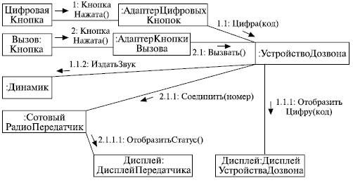 Конечно же! Ведь это последний пример, который мы рассматривали, говоря о диаграммах последовательностей, - мобильный телефон! Как видим, это просто другая форма представления, к тому же, на наш взгляд, менее удобная. Впрочем, в команде могут работать различные люди, с различными предпочтениями и особенностями восприятия, так что какой вид диаграмм использовать для описания логики сценариев - диаграммы последовательностей или диаграммы кооперации - решать вам.