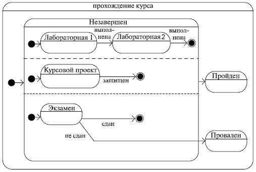 Здесь мы видим составное состояние, включающее другие состояния, одно из которых содержит также параллельные подсостояния. Мы не говорили ранее о том, как все это обозначается, но ведь и так понятно - это диаграмма прохождения академического курса студентом. Для того чтобы пройти курс, студент должен выполнить лабораторные работы, защитить курсовой проект и сдать экзамен. Все просто!