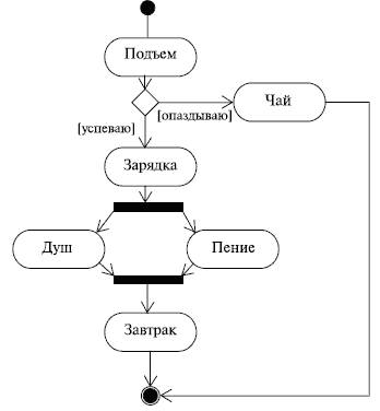 Многие из нас именно так начинают свой день, не правда ли? Обратите внимание на то, как изображено параллельное пение и принятие душа, - на обычной блок-схеме это было бы невозможно! А вот еще пример(рис. 22):