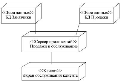 Диаграмма развертывания показывает топологию системы и распределение компонентов системы по ее узлам, а также соединения - маршруты передачи информации между аппаратными узлами. Это единственная диаграмма, на которой применяются "трехмерные" обозначения: узлы системы обозначаются кубиками. Все остальные обозначения в UML - плоские фигуры. Но приведем пример (рис. 24):