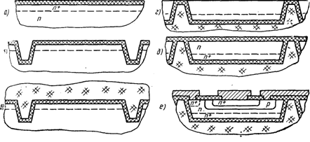 а — исходная пластина; б — избирательное травление окисла, глубокое травление кремния, окисление поверхности; в — осаждение поликристаллического кремния; г — шлифование и полирование обратной стороны пластины; д — окисление поверхности; е — готовая структура после базовой и эмиттерной диффузии и получения межсоединений