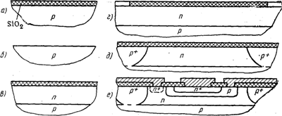 а—исходная пластина; б—стравливание окисла, подготовка поверхности; в—эпитаксиальное наращивание n-слоя, окисление поверхности; г—вскрытие окон в окисле под изолирующую (разделительную) диффузию примеси; д — диффузия акцепторной примеси, окисление поверхности; е — готовая структура после формирования диффузионных базовых и эмиттерных областей, а также получения межсоединений