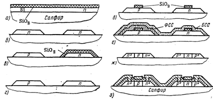 а—исходная пластина «сапфир—эпитаксиальный кремний—окись кремния»; б—избирательное анизотропное травление кремния с помощью оксидной маски (образование островков); в—избирательная диффузия акцепторной примеси; г — снятие маски с островков; д — маскирование островков с помощью SiO2; е — избирательное покрытие фосфорсиликатным стеклом (ФСС) р-островков и общее покрытие боросиликатным стеклом (БСС); ж— структура после диффузии примесей и стравливания БСС, ФСС и SiO2, з — готовая структура после нанесения SiO2 и формирования межсоединений