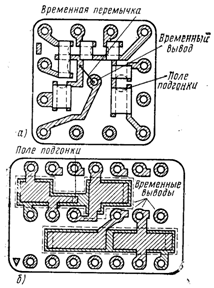 При подгонке конденсаторов необходимо тщательно подбирать режимы обработки во избежание короткого замыкания обкладок. В процессе подгонки выводы подложки устанавливают в контактное приспособление, связывающее элементы схемы с измерительным устройством. Затем, последовательно «опрашивая» элементы, их измеряют и обрабатывают. Для этого каждый элемент схемы должен иметь индивидуальный выход на выводы подложки. При необходимости вводят либо временные (технологические) перемычки, впоследствии удаляемые (рис. 2.50,а), либо временные армированные выводы, которые отрезают после подгонки (рис. 2.50,6).