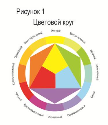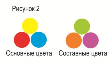 Основными цветами (или первичным треугольником) считаются красный – желтый – синий. От смешения основных цветов получают составные цвета (иначе называемые производными или вторичным треугольником), это - оранжевый, зеленый, фиолетовый. (Рис.2)