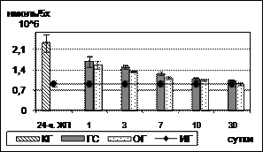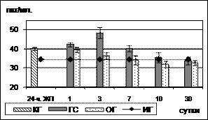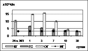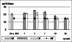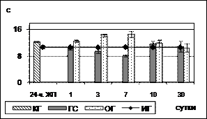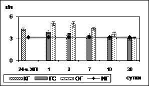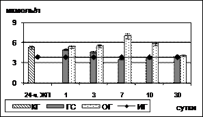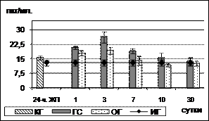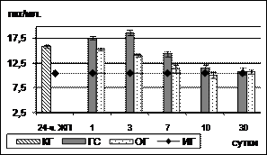 При лечении у животных в группе сравнения, наблюдался однонаправленный рост IL-1α и IL-1β с максимальными изменениями, приходящимися на 3-сутки (p<0,001) и нормализацией показателей на 10-е сутки (p>0,05) (рис. 1 а, б). В то же время в основной группе нормализация показателей отмечалась уже на 7-е сутки (p>0,05) (рис. 1б), что может быть результатом активной деконтаминации содержимого тонкой кишки после проведения КД и детоксикации организма при НЭХО крови с использованием НГХ.