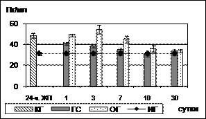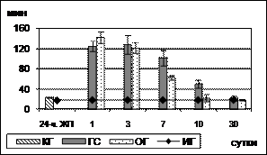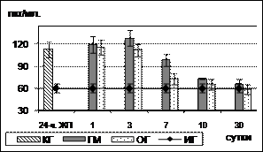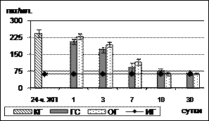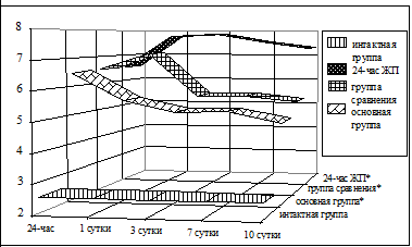 Общеизвестно, что основным хемокином, вызывающим приток НЛ в очаг воспаления является IL-8, исследование которого у животных с АСЖП показало почти 3-кратное повышение его уровня в крови (p<0,001) (рис. 2б). В ходе лечения отмечалась разнонаправленная динамика IL-8, а именно на 1-е сутки в группе сравнения происходило его снижение до 61,0±5,1 пкг/мл, а в основной группе повышение до 91,0±6,3 пкг/мл против 86,4±8,9 пкг/мл у животных контрольной группы. В обоих случаях уровень IL-8 оставался достоверно высоким относительно интактных животных (р<0,001), что по-видимому связано с активацией миграции нейтрофилов, моноцитов, Т-лимфоцитов и фибробластов в очаг воспаления. И только к 7-м суткам показатели IL-8 приходили к исходным значениям (р>0,05) (рис. 2б).