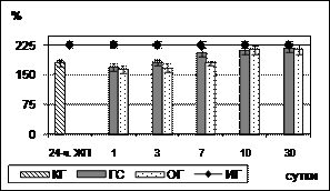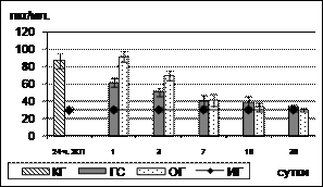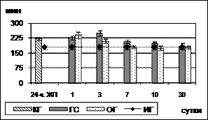 Противоположная картина наблюдалась в основной группе, когда с первых суток лечения наблюдалось снижение уровня IL-4 и IL-10, относительно животных контрольной группы, которое однако оставалось еще достоверно значимым относительно животных интактной группы (р<0,05) (рис. 3 а, б). Нормализация IL-4 в основной группе происходила на 3-и сутки, а IL-10 ‑ только на 7-е сутки (p>0,05), что объясняется, разным по силе эффектом НГХ при КД и НЭХО крови на синтез IL-4 и IL-10, позволяющих регулировать, а в финале и прерывать миграционный поток лимфоцитов в очаг воспаления.