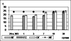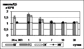 При исследовании продукции NO в суспензии Тр у животных с АСЖП, отмечалось достоверное увеличение её содержания относительно интактных животных (p<0,05) (рис. 4 б), которое может быть направленно на повышение адгезивной и агрегационной активности Тр к эндотелию. На первые сутки лечения в исследуемых группах наблюдалось дальнейшее повышение продукции NO (p<0,05), которое начиная с 3-х суток в группе сравнения снижалось и приходило к исходным цифрам на 7-е сутки (p>0,05), в то время, как в основной группе оно приходило к исходным величинам уже на 3-и сутки (p>0,05) (рис. 4 б), что может быть направлено на блокаду каскадных расстройств в системе гемостаза, как результат гипохлорит-ингибирующего воздействия на активность фосфолипазы С и процессы образования тромбоксана А2 в тромбоцитах.