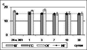 Одновременно, у животных с АСЖП отмечалось 4-кратное повышение уровня IL-6 относительно интактных животных (р<0,001) (рис. 2 а), что связано с активацией НЛ и интенсивностью воспаления. При корреляционном анализе обнаружена сильная прямая связь с одной стороны между IL-6 и количеством Тр (r= 0,78, p<0,05), а с другой – содержанием ФВ (r= 0,89, p<0,05), соответственно. Одновременно выявлена умеренной силы обратная корреляционная связь с одной стороны между уровнем IL-6 и АТ III (r= -0,67, p<0,05), а с другой – между IL-6 и ХЗФ (r= -0,69, p<0,05), соответственно, что указывает на участие IL-6 в активации сосудисто-тромбоцитарного и антикоагуляционного звена гемостаза. При лечении животных нормализация IL-6 в группе сравнения, приходилась на 7-е сутки (p>0,05), в то время, как в основной группе только на 10-е сутки (p>0,05) (рис. 2 а), что можно объяснить, по-видимому, окислением НГХ реактивного участка ингибитора протеиназ, в результате которого последний теряет возможность инактивировать эластазу, выделяемую стимулированными НЛ.