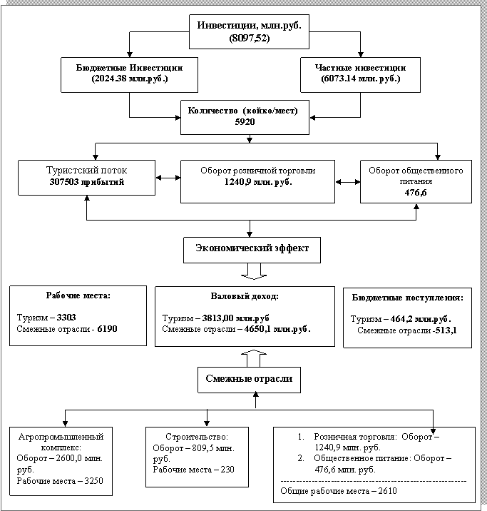 Концепция развития туризма в Тункинском районе служит научным основанием для долгосрочного и текущего планирования развития, как самой туристской отрасли, так и отраслей, входящих в кластер туризма. В рамках предлагаемой концепции, было проведено финансово–экономическое обоснование привлекаемых инвестиций, направляемых на развитие туристско-рекреационного кластера «Тункинская долина» (рис. 12)[72].