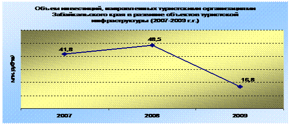 По мнению специалистов в Забайкальский крае, среди основных проблем выступает неразвитая инфраструктура. Сокращение инвестиций в строительство инфраструктуры туризма значительно тормозит развитие туриндустрии поэтому некоторые предприятия прибегают к самостоятельному инвестированию. По данным Министерства МСВЭСТ в 2009 году туристскими организациями продолжалось строительство и реконструкция баз отдыха в наиболее посещаемых туристами рекреациях края (Ивано-Арахлейский государственный природный ландшафтный заказник регионального значения и туристско-рекреационный комплекс «Алханай»). Объем инвестиций представлен на рисунке 14.