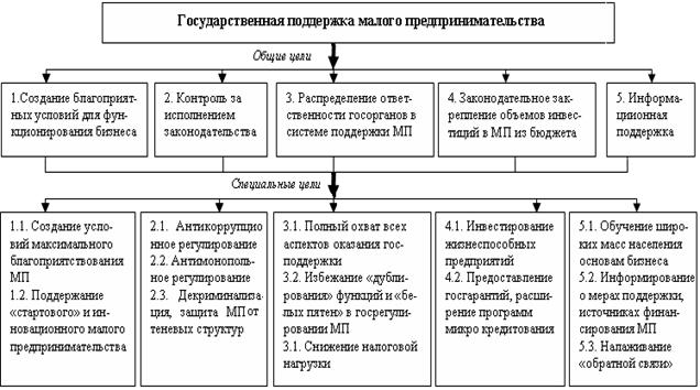Хотелось бы отметить, и то, что регулирование и поддержка малого предпринимательства заключается в стимулировании развития предпринимательства со стороны государства в соответствии с определенными целями и принципами осуществления поддержки. Определение целевых ориентиров поддержки и развития малого предпринимательства должно исходить из необходимости сочетания интересов, как государства, так и малых предприятий с учетом текущего состояния экономики страны. В странах с развитой рыночной экономикой упор делается на реализацию частных целей, так как уже сформирован и эффективно работает сектор малого бизнеса. В России упор делают на решение общих проблем — совершенствование налогообложения, развития инфраструктуры рынка и т. п. Направления поддержки малых предприятий отражаются в Федеральных Программах поддержки малого предпринимательства.