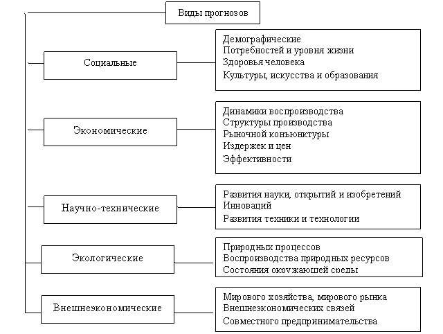 Глобальные прогнозы рассматривают наиболее общие тенденции и закономерности экономики в мировом масштабе; макро прогнозы служат для прогнозирования общих тенденций на уровне страны в целом; структурные — для предсказания развития комплексов народного хозяйства в разрезе республик, регионов, их отдельных социальных и производственных сфер; региональные — предсказывают развитие отдельных регионов страны; отраслевые прогнозы определяют тенденции развития отдельных отраслей народного хозяйства; микропрогнозы разрабатывают для организаций по видам продукции.