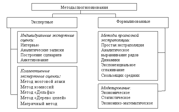 Все методы прогнозирования условно можно подразделить на две большие группы: интуитивные (экспертные) и формализованные. В основу такой классификации положен принцип действия и способ получения информации. Экспертные методы прогнозирования включают индивидуальные и коллективные экспертные оценки. К формализованным методам относятся методы экстраполяции и моделирования (рис. 2).
