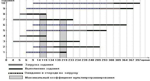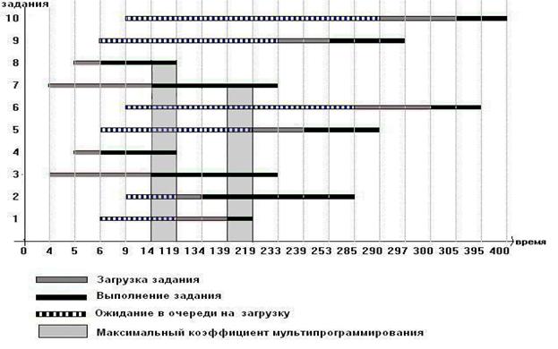 Рис. 3 .Мультипрограммирование с учетом требований к памяти и НМЛ (ДО - FIFO).