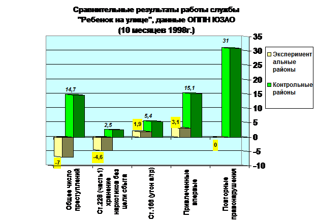 Работа по проекту проводилась в пяти из двенадцати муниципальных районов Юго-Западного административного округа (ЮЗАО) города Москвы*. Статистика приведена по экспериментальным районам, в которых работала служба «Ребенок на улице», а также ряд других служб («Ребёнок дома», Приют-убежище для детей и подростков «Дорога к дому», службы, осуществляющие реабилитационные программы, социальная служба при судье – Черёмушкинский районный суд г. Москвы) и по контрольным районам, в которых названные службы не работали (что было определено проектом). Для сравнения взяты пять стандартных показателей отчетности ОППН по состоянию преступности в ЮЗАО[1].