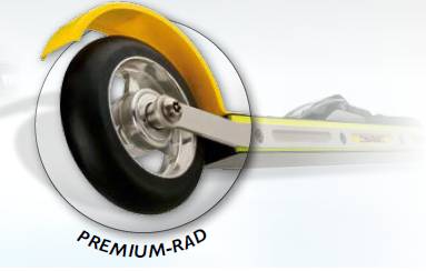 Колеса состоят из различных смесей резины и имеют разную твердость и обозначены буквами S, M, F: медленные, средние и быстрые. Это обеспечивает оптимальное сцепление на мокрой и сухой дороге. Колесный диск из легкого сплава заботится об идеальном отводе тепла от резины. Упругой брызговик, который установлен на обоих колесах помогает свести к минимуму брызги на мокрой трассе. На этих моделях переднее колесо снабжено серийно заграждением обратного хода (тормоз). Это заграждение (тормоз) создаёт чувство движения похожему при передвижению по снегу и имитирует скольжение по снегу.