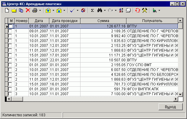 Рисунок 11. Списковая форма документов «Арендные платежи».