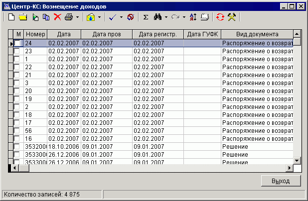 Рисунок 14. Списковая форма документов «Возмещение доходов».
