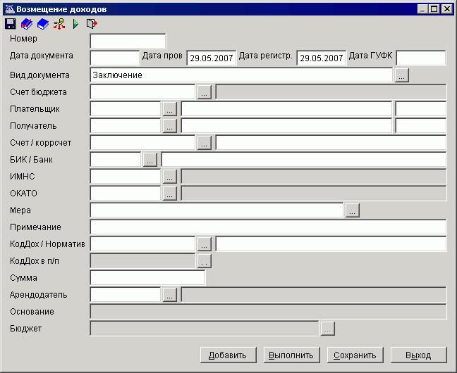Рисунок 15. Форма ввода документа «Возмещение доходов».