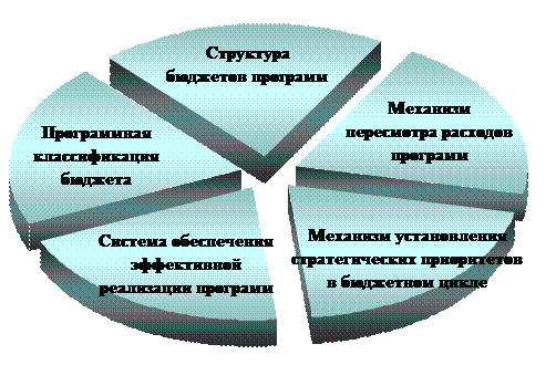 В основе программного бюджетирования лежит программная классификация расходов, структура которой определяется целями и задачами социально-экономической политики. Основополагающими элементами системы обеспечения эффективной реализации программ выступают: совокупность ключевых показателей эффективности расходования бюджетных средств, механизмы оценки и аудита программ, система стимулов для распорядителей бюджетных средств (РБС). Для целей проведения оценки и установления приоритетов бюджетной политики важным является наличие механизмов учета информации относительно эффективности реализуемых программ в бюджетном цикле.