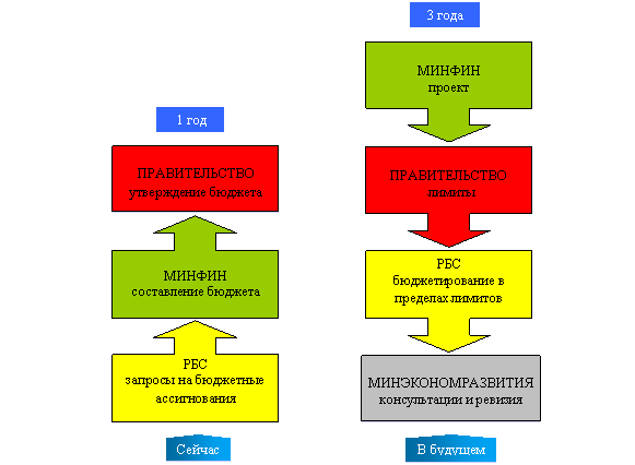 · Бюджетирование «сверху-вниз» (правительство с подачи Минфина, РБС):