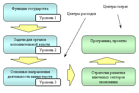 Отправной точкой построения программного бюджета является установление тесной взаимосвязи между функциями государства и его стратегическими целями путем увязки полномочий каждого РБС или центра расходов с государственной политикой в конкретном секторе (рисунок 3). Подпрограммы и проекты, реализуемые в рамках программ, являются центрами затрат, для которых разрабатывается экономическая или предметная классификация расходов. Программный бюджет в отличие от традиционного составляется на основе классификации расходов по типу услуг и целей, а не поступлений. Программная структура является способом описания расходов в контексте достижения поставленных целей. Стратегические цели правительства выражаются в виде детализированных ключевых задач РБС.