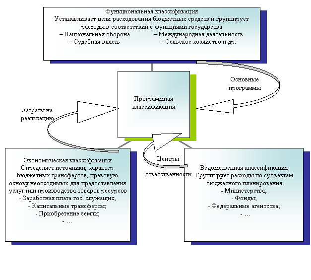 Как показывает мировой опыт, программная классификация разрабатывается с учетом и на основании потребностей отдельно взятой бюджетной системы, отличается по степени детализации и организационной ориентации. Она тесно связана с организационной структурой РБС, способствуя тем самым установлению ответственности за результаты реализации программ и ее компонентов (подпрограмм и проектов), формируемых на основе функциональной классификации; в свою очередь экономическая классификация расходов служит источником информации о потребляемых в рамках программ ресурсов (рисунок 4).