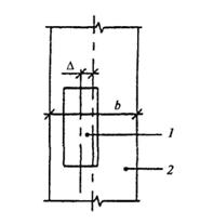 1 - балка 2 - колонна | Расположение сопряжения балки с колонной, замеренное относительно колонны. b - размер колонны в том же направлении, что и Δ | Наибольшее ±b/30 или ±12 мм |