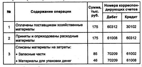 КБ «Альтернатива» приобрел в порядке предоплаты канцтовары, бумагу для ксерокса, соответственно на 85 тыс. руб. и на 90 тыс. руб. Одновременно, согласно акту, утвержденному зам. председателя банка, списываются израсходованные в течение месяца запчасти для автотранспорта — на 85 тыс. руб., материалы для упаковки денег — на 46 тыс. руб.