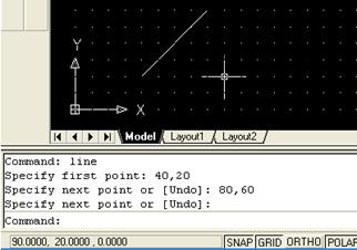 После записи Specify next point or [Undo]: возможно указание относительных координат второй точки линии (@80, 60 или @50 < 45).