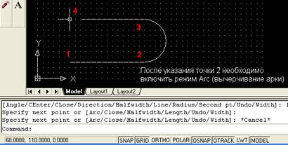 Specify endpoint of arc or [Agle/CEnter/CLose/Direction/ Halfwidth/Line/Radius/Second pt/Undo/Width]: (диалог с предложением выбрать вариант построения арки. Используем простейший способ, заключающийся в указании точки 3 курсором мыши);