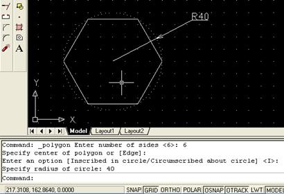 Specify radius of circle: 40 (указываем радиус окружности и нажимаем Enter для завершения рисования).