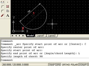 Порядок работы в командной строке при построении дуги: