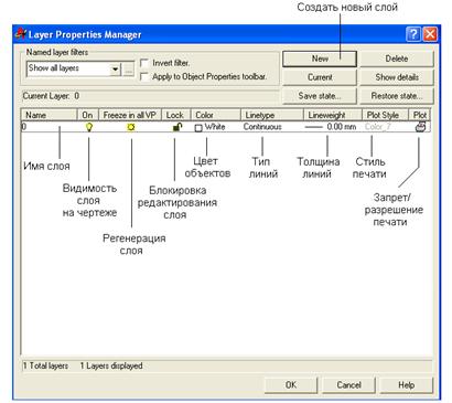Кнопка Current (Текущий) задает статус текущего слоя, т. е. такого, в который будут помещены все объекты, нарисованные впоследствии. В окне, расположенном справа от метки Current Layer (Текущий слой), высветится имя выбранного вами слоя.