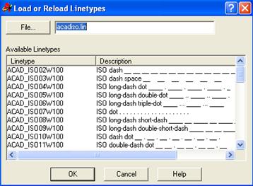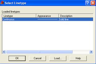 Для загрузки дополнительных типов линий необходимо в окне Layer Properties Manager нажать на текущий тип линии в столбце Linetype (Continuous на рис. 3.2). Загрузится окно Select Linetype (рис. 3.3), в котором следует использовать кнопку Load. Требуемый тип линии выбирается в появившемся меню Load or Reload Linetypes (рис. 3.4) двойным щелчком левой кнопки мыши.