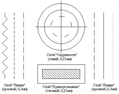 2. Назначьте различным слоям указанные цвета, типы линий и их толщину.